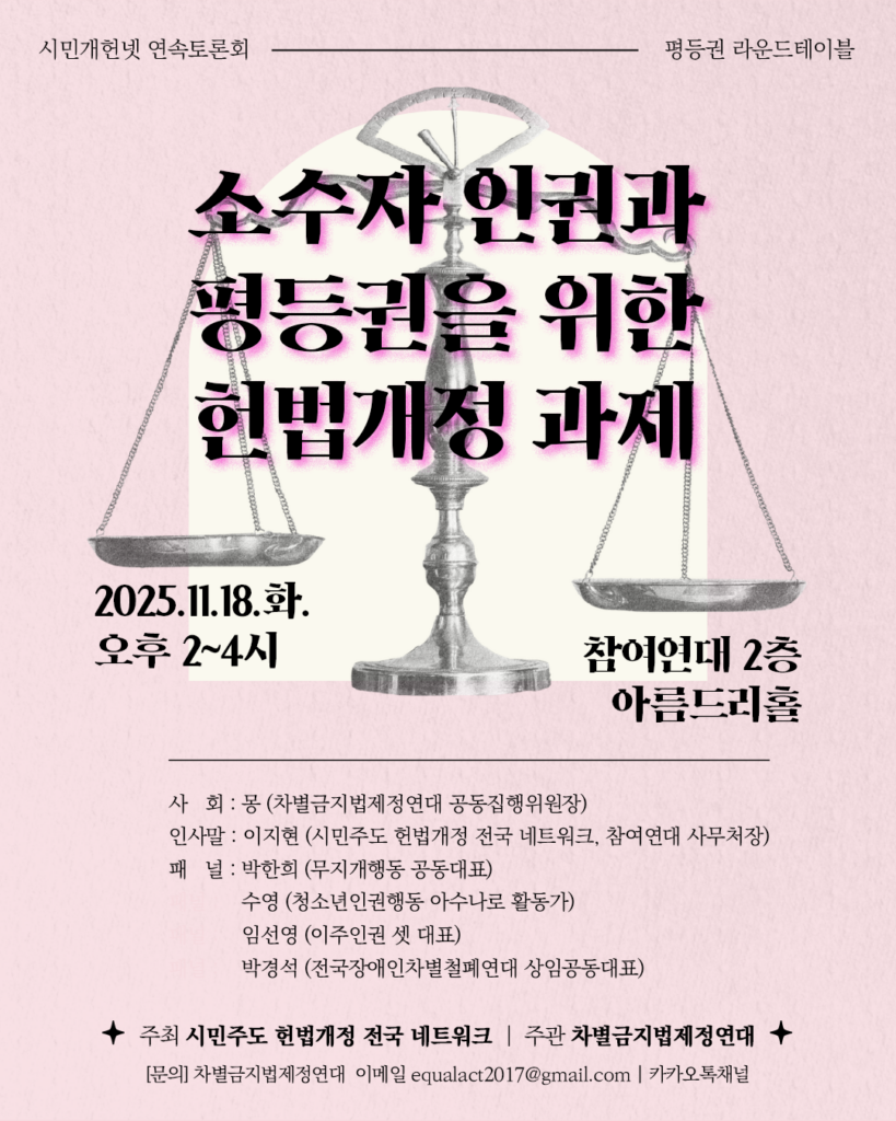 새로운 대한민국을 위한 헌법개정을 시민의 힘으로 실현하기 위한 ‘시민주도 헌법개정 전국 네트워크'(시민개헌넷)의 연속토론회, 11/18(화)에는 평등권을 주제로 한 라운드테이블이 열립니다!