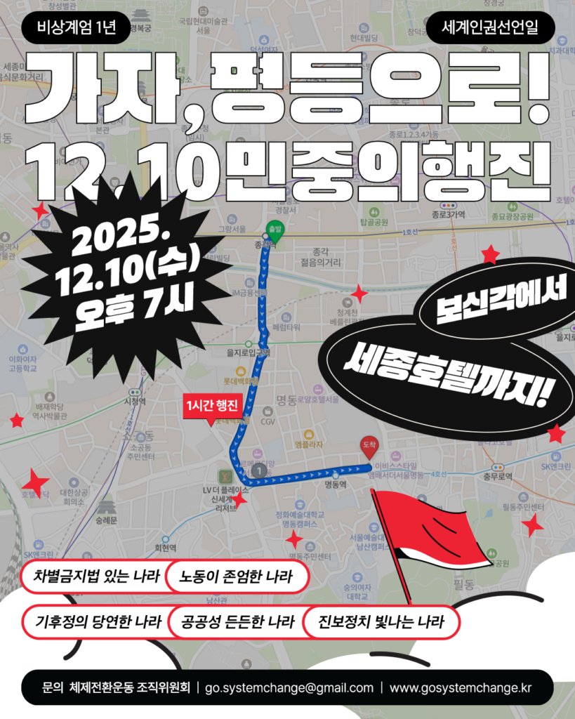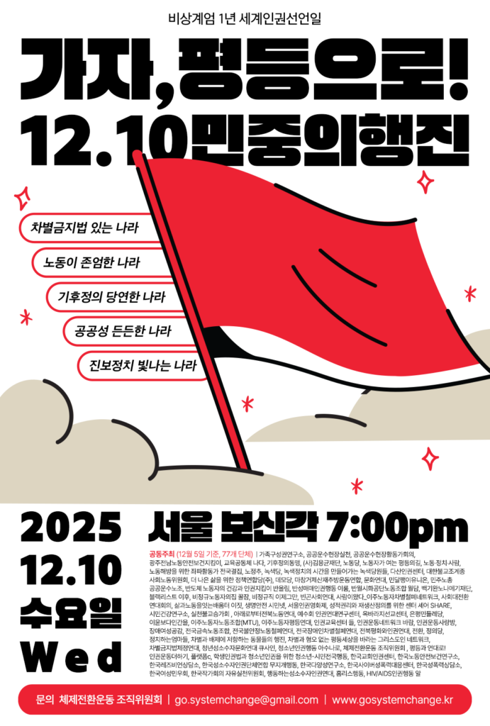 비상계엄 사태로부터 1년, 여전히 위태로운 민주주의와 우리 삶을 지키기 위해, 평등의 요구는 이어져야 합니다. 대통령을 바꾸고 세상도 바꾸자고 했던 광장의 외침을 기억하며, 파시즘의 야만으로부터 존엄을 선언했던 12.10 세계인권선언일 함께 모입시다! 존엄과 평등의 새로운 민주주의를 향해 함께 행진합시다!
