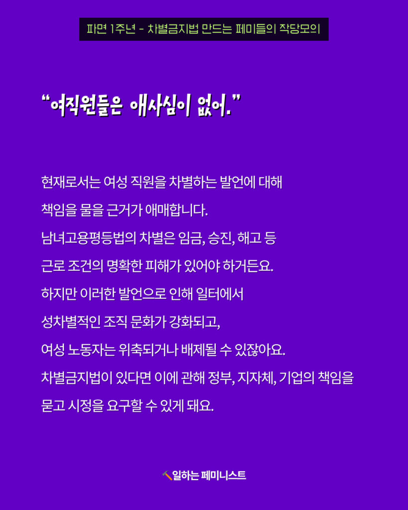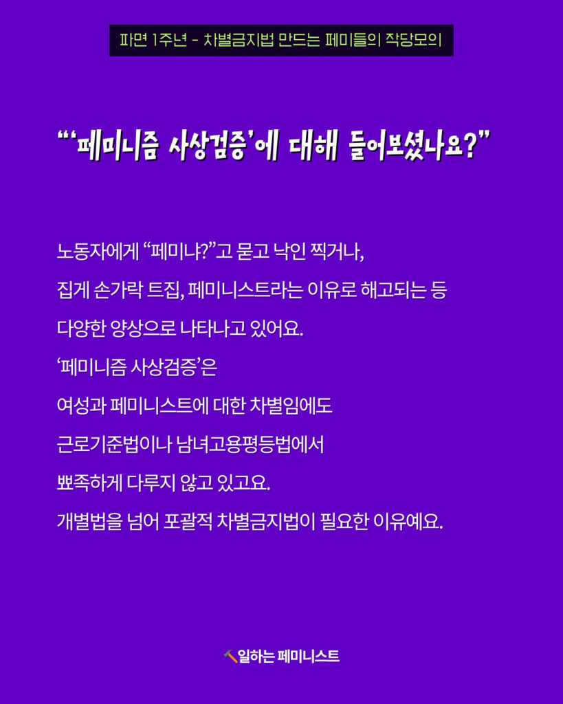 노동자에게 “페미냐?”고 묻고 낙인 찍거나, 집게 손가락 트집, 페미니스트라는 이유로 해고되는 등 다양한 양상으로 나타나고 있어요. ‘페미니즘 사상검증’은 여성과 페미니스트에 대한 차별임에도 근로기준법이나 남녀고용평등법에서 뾰족하게 다루지 않고 있고요. 개별법을 넘어 포괄적 차별금지법이 필요한 이유예요.