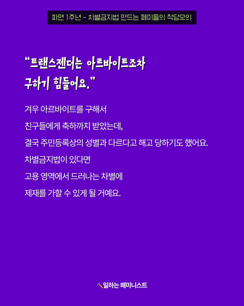 겨우 아르바이트를 구해서 친구들에게 축하까지 받았는데, 결국 주민등록상의 성별과 다르다고 해고 당하기도 했어요. 차별금지법이 있다면 고용 영역에서 드러나는 차별에 제재를 가할 수 있게 될 거예요.