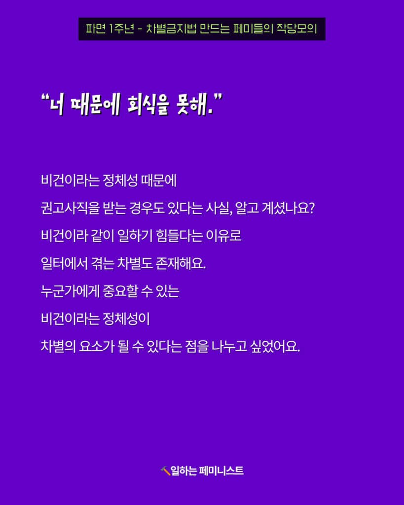 비건이라는 정체성 때문에 권고사직을 받는 경우도 있다는 사실, 알고 계셨나요? 비건이라 같이 일하기 힘들다는 이유로 일터에서 겪는 차별도 존재해요. 누군가에게 중요할 수 있는 비건이라는 정체성이 차별의 요소가 될 수 있다는 점을 나누고 싶었어요.