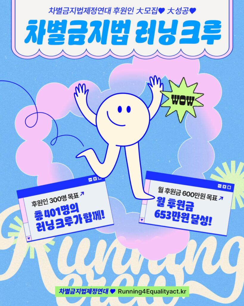차별과 혐오 선동 앞에 평등과 공존의 조건이 무너지는 바로 지금, 우리는 새로운 민주주의를 열고 평등으로 나아가야 할 때입니다. 이제 차별금지법 제정까지 함께 달릴 러닝크루와 함께 22대 국회 내 제정을 목표로 다시 가열찬 입법 투쟁을 시작해나가겠습니다. 앞으로 차별금지법제정연대가 만들어갈 활동과 투쟁에 관심과 참여를 부탁드립니다. 혹시 이번 모집 사업에 참여하지 못하셨더라도, 차별금지법제정연대의 후원은 언제나 열려있습니다 (후원하기🙌)