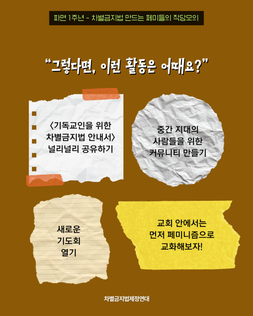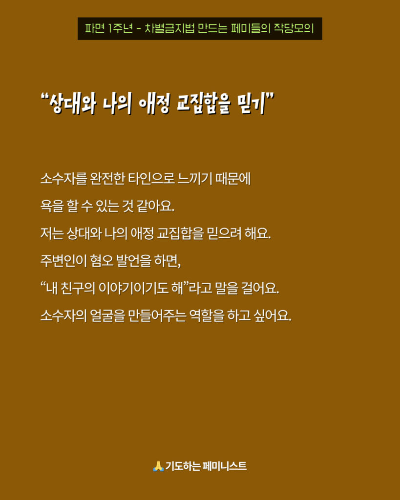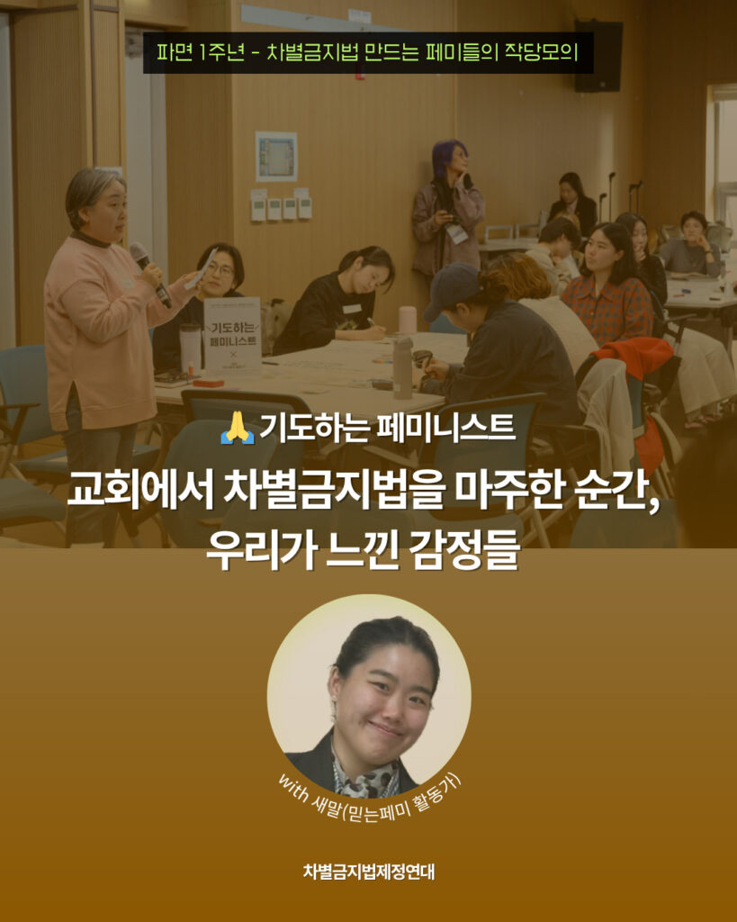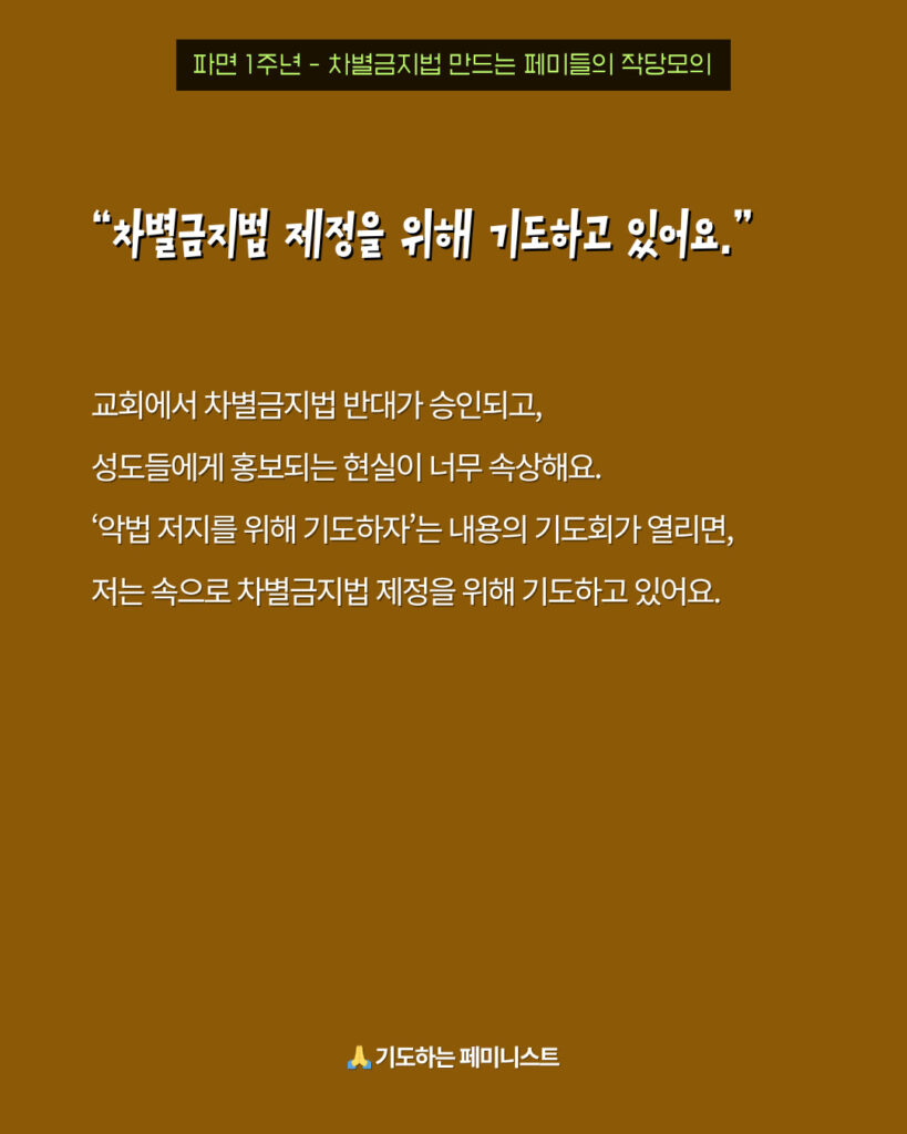 교회에서 차별금지법 반대가 승인되고, 성도들에게 홍보되는 현실이 너무 속상해요. ‘악법 저지를 위해 기도하자’는 내용의 기도회가 열리면, 저는 속으로 차별금지법 제정을 위해 기도하고 있어요.