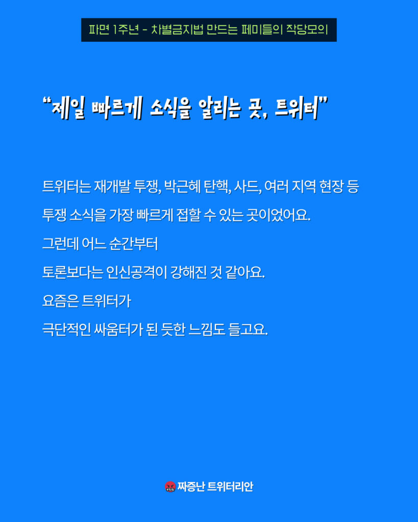 트위터는 재개발 투쟁, 박근혜 탄핵, 사드, 여러 지역 현장 등 투쟁 소식을 가장 빠르게 접할 수 있는 곳이었어요. 그런데 어느 순간부터 토론보다는 인신공격이 강해진 것 같아요. 요즘은 트위터가 극단적인 싸움터가 된 듯한 느낌도 들고요.