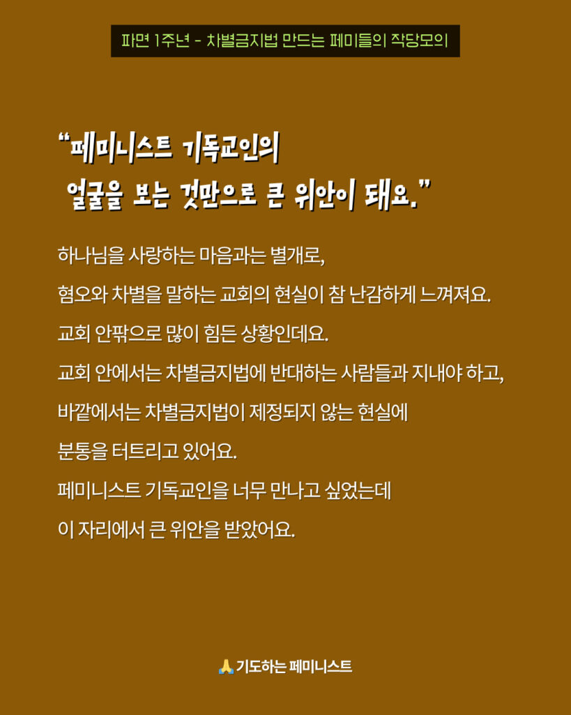 하나님을 사랑하는 마음과는 별개로, 혐오와 차별을 말하는 교회의 현실이 참 난감하게 느껴져요. 교회 안팎으로 많이 힘든 상황인데요. 교회 안에서는 차별금지법에 반대하는 사람들과 지내야 하고, 바깥에서는 차별금지법이 제정되지 않는 현실에 분통을 터트리고 있어요. 페미니스트 기독교인을 너무 만나고 싶었는데 이 자리에서 큰 위안을 받았어요.