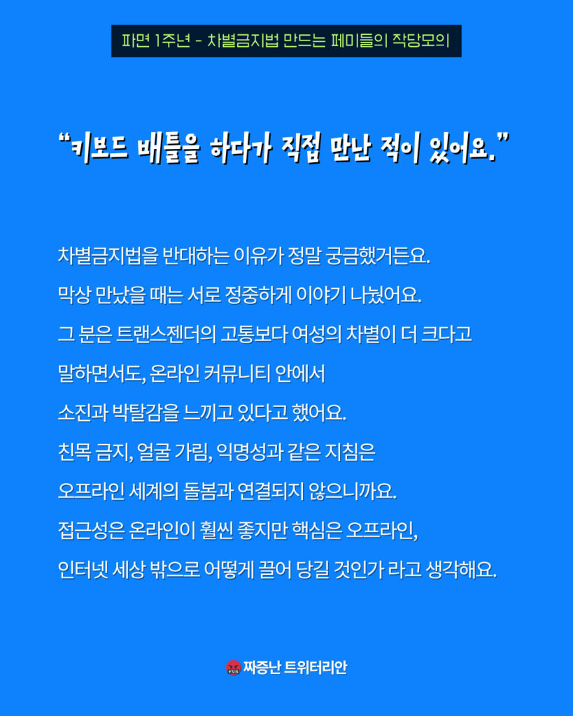 차별금지법을 반대하는 이유가 정말 궁금했거든요. 막상 만났을 때는 서로 정중하게 이야기 나눴어요. 그 분은 트랜스젠더의 고통보다 여성의 차별이 더 크다고 말하면서도, 온라인 커뮤니티 안에서 소진과 박탈감을 느끼고 있다고 했어요. 친목 금지, 얼굴 가림, 익명성과 같은 지침은 오프라인 세계의 돌봄과 연결되지 않으니까요. 접근성은 온라인이 훨씬 좋지만 핵심은 오프라인, 인터넷 세상 밖으로 어떻게 끌어 당길 것인가 라고 생각해요.