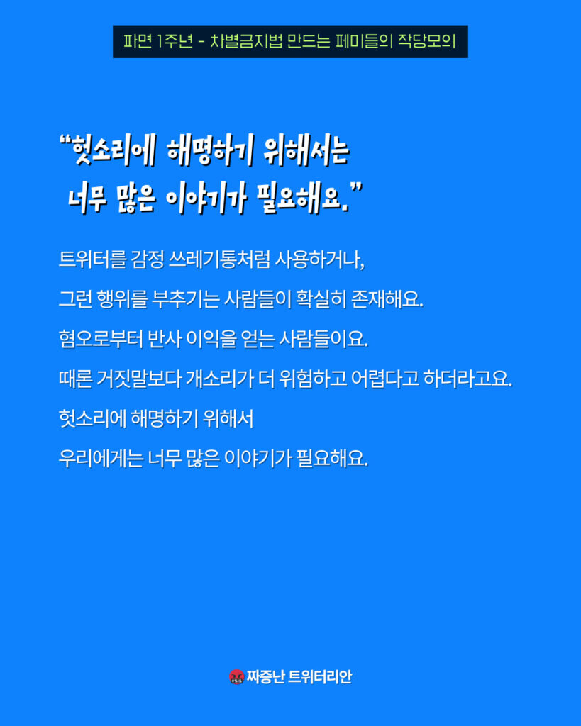 트위터를 감정 쓰레기통처럼 사용하거나, 그런 행위를 부추기는 사람들이 확실히 존재해요. 혐오로부터 반사 이익을 얻는 사람들이요. 때론 거짓말보다 개소리가 더 위험하고 어렵다고 하더라고요. 헛소리에 해명하기 위해서 우리에게는 너무 많은 이야기가 필요해요.