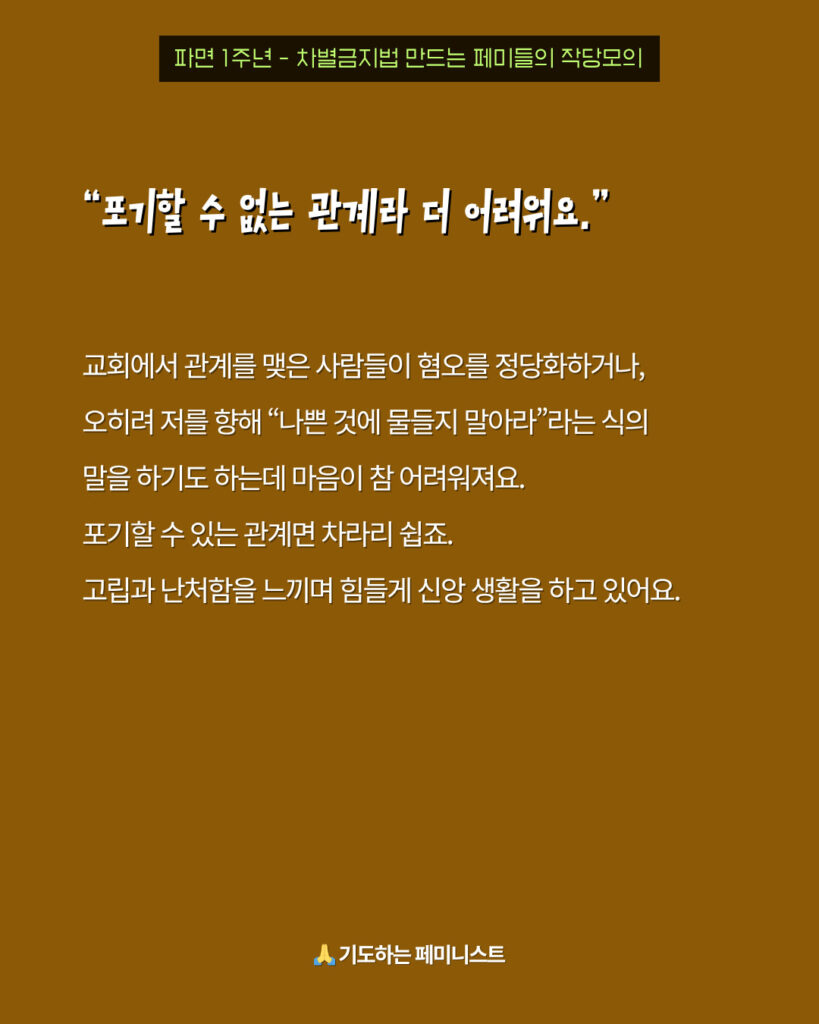 교회에서 관계를 맺은 사람들이 혐오를 정당화하거나, 오히려 저를 향해 “나쁜 것에 물들지 말아라”라는 식의 말을 하기도 하는데 마음이 참 어려워져요. 포기할 수 있는 관계면 차라리 쉽죠. 고립과 난처함을 느끼며 힘들게 신앙 생활을 하고 있어요.